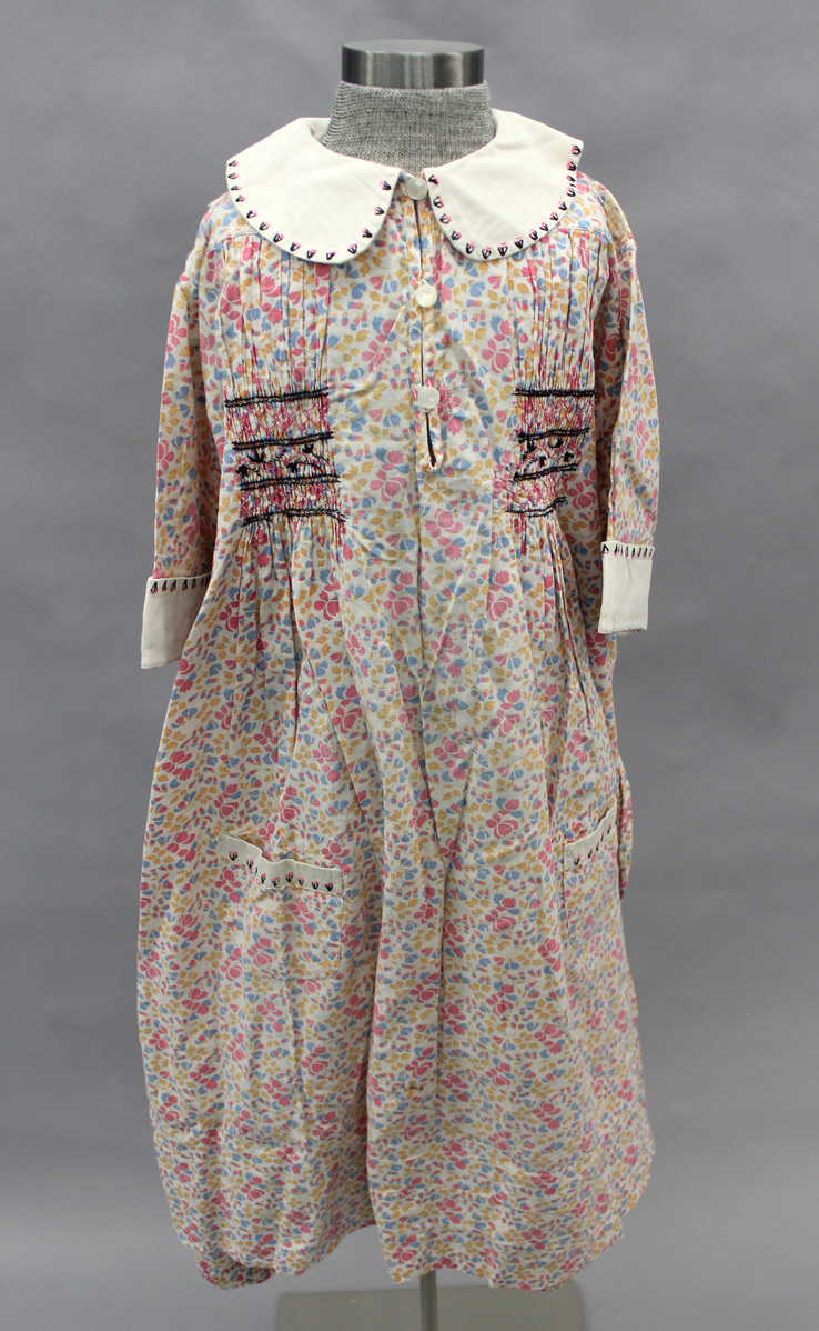 a: Dress - printed multi-colored cotton calico child's dress; short sleeves with off-white cuff with embroidered edge; off-white round collar with embroidery; smocking in front and back; two flat pockets pockets with embroidery; center front opening with pearl button closure B: Bloomers - matching cotton calico child's bloomers; waistband with buttonholes; gathers at legs; side openings
