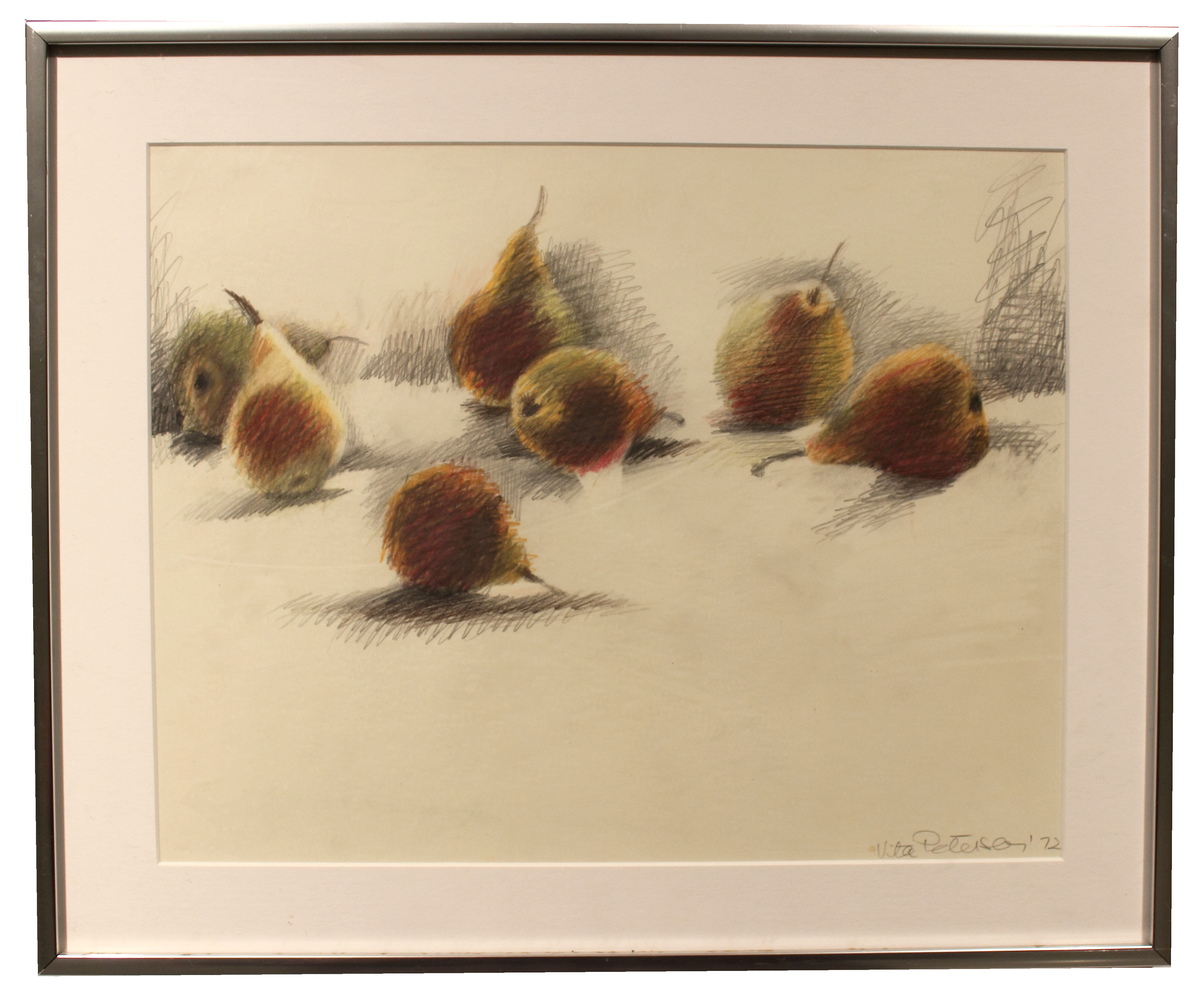 Colored pencil drawing of group of seven green pears set at various angles. Signed "Vita Peterson '72" Framed under glass with silver metallic frame.