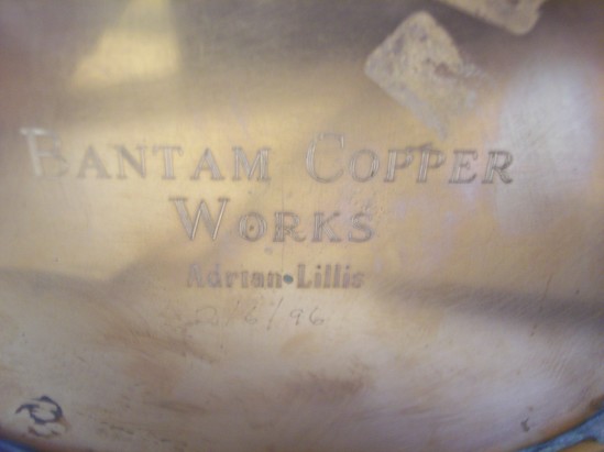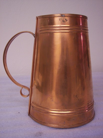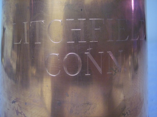 Large copper tankard with Litchfield, Conn engraved on front. There is a seam along the bottom edge where the base meets the shaft and a seam in the back that runs the length of the vessle. It is a folded over seam. The bottom has been soldered and meets at the seam in the rear