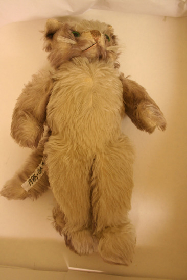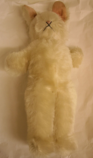 A - Off white and grey cat like stuffed animal with green and black eyes, white front, grey face, ears and back with long tail. Long legs. B - White bunny rabbit stuffed animal with pink and red eyes, pink nose and black thread mouth, pink velvet ear lining, white fur, long legs.