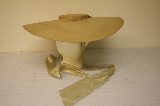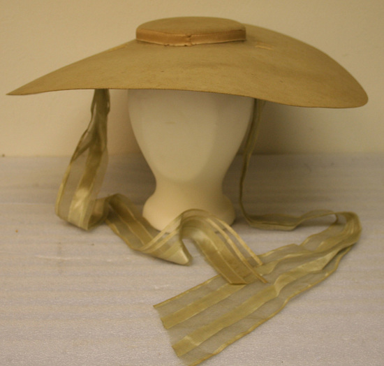 Woman's Hat, light brown or beige felt large brim hat with shallow/flat crown, two light green silk guaze neck ties which are atttched at underside. Label inside of "Made and Sold by Benjamin Hooton at the Sign of the Hat Four Doors below the Church in Second Street Philadelphia" Written on lining "Anne Pim"