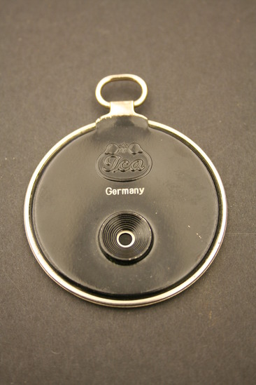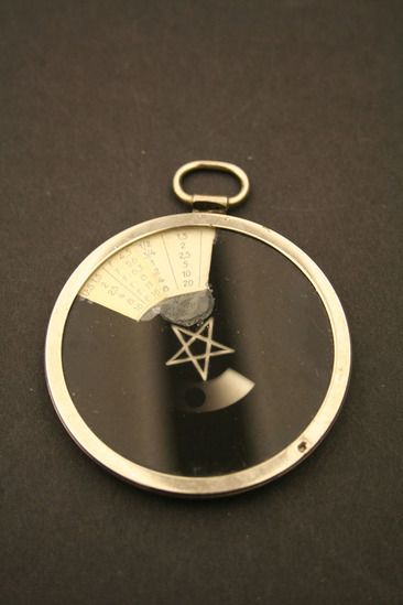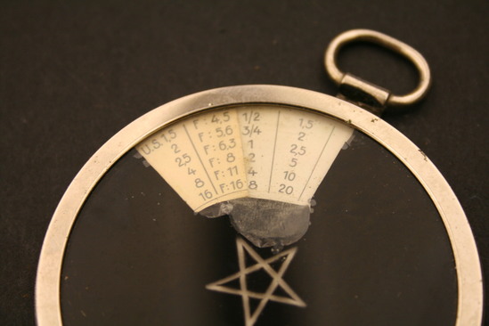 Round light meter - case is silver with hook at top; back side black plastic, in center small eye viewer which can be turned to change light filter from completely open to completely shut; front is glass; trapizoid shaped cut out at top showing bars of numbers that correspond to level of light passing through meter; small band below center where eye piece looks through - clear white on right shifting to completely black on left