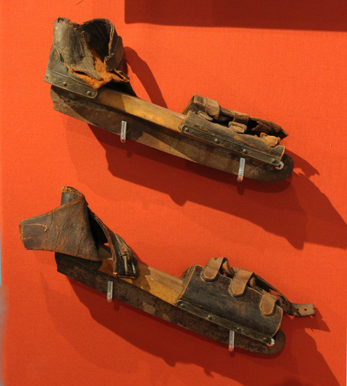Ice skates - wooden base with steel blade; leather band across top of foot and at heel; three metal buckles close leather across top of foot; one metal buckle at ankle; leather attached to wooden base with iron nails; short nail head protruding from bottom of heel