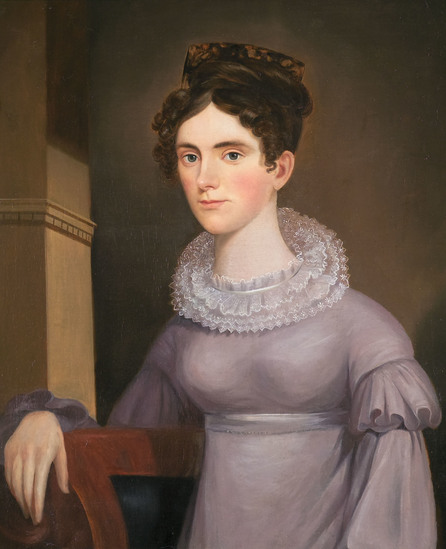 Head and torso of Jane C. Wolcott. Young woman (probably in her 20s) wearing a long sleeve, empire styel light purple dress with ruffled white collar. Brown hair which is curled around face and braided on top of her head. Greek pillar in background. Sitting sideways in a chair with arm bent over arm rest. Background a brownish color.