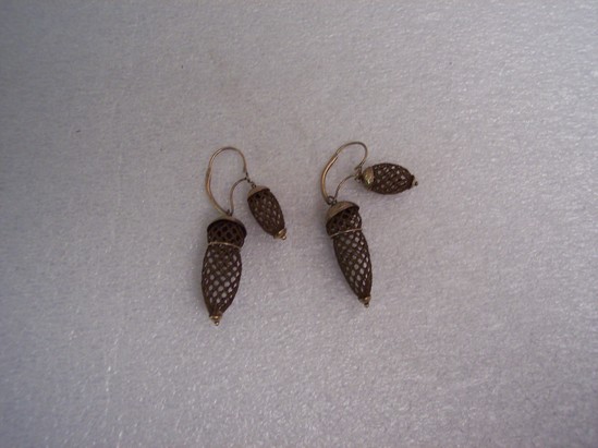 Tear shaped gold ear loop with 1 acorn shaped open work woven hair body tassel and gold end and cut work, gold cap fixed by loop to ear loop. Larger woven open work hair tassell with gold finial, gold ring 2/3 up and cut work gold cap larger and on unfixed gold loop