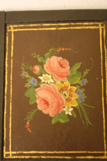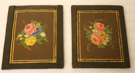Two wooden boards. Painted in center with slightly different floral spray decorations. Gold border around outside of design. Background of paintings brown with wide black border acting as a frame to picture.