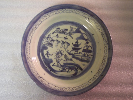 Deep plate. Blue and white river scene in the center with a solid blue rim.