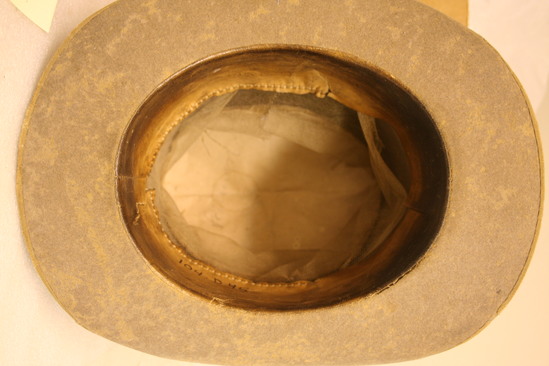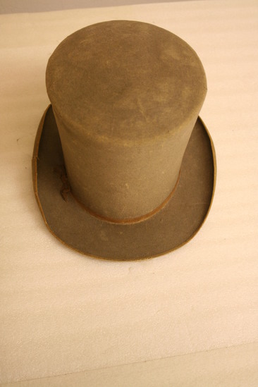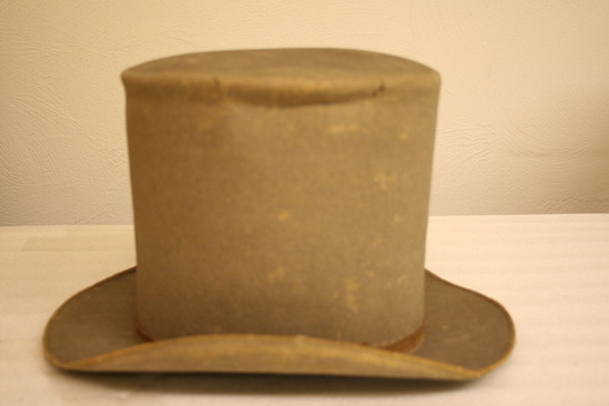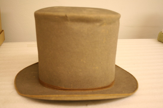 Grey felt top hat' brim 2 1/4" wide; flat in front and back, edges folded up on sides; edges covered in gold/tan grosgrain ribbon; crown tall with falt top, growing wider at top; 1/2" brown ribbon around base of crown with small bow on back right side (when facing hat); lining (interior) a netting with paper on top an dcanvas band; "Kilbourn" written in pencil on top of interior