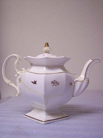 Large white teapot with gold highlights and gold floral motifs around the sides of the pot. Spout is s-shaped and has a gold sunburst on it. Scalloped lip at the top of the pot. Large, decorative handle. Teapot (A) is on a diamond-shaped, footed base. The lid (B) is a paneled dome with a pointed finial.