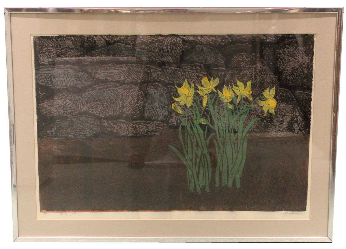 Wood block printed painting, lower background in two tones of brown, dark over light, upper background depicting a stone wall, printed in two tones of grey, dark/black over light, grey, centrally located clump of yellow daffodils in bloom, with green stems and leaves. Framed in simple modern chrome frame.