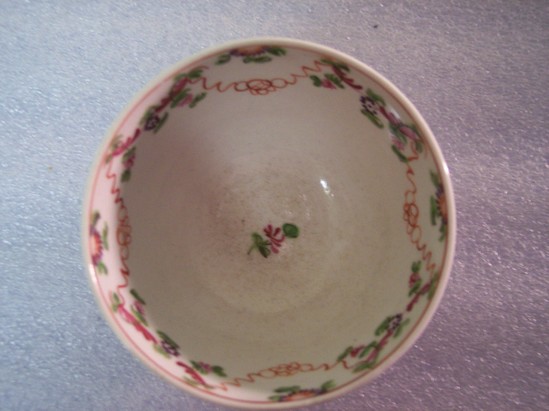Tea bowl is decorated with garlands of flowers in polychrome and is overglazed. No handles. Has single, small flower at the base on the interior.