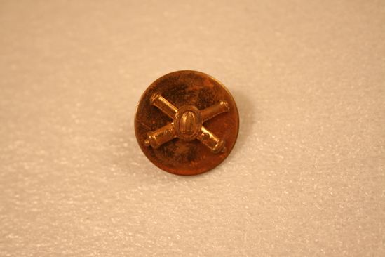 Round metal pin, gold colored with raised image of 2 cannons crossing each other in center
