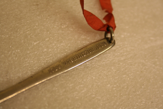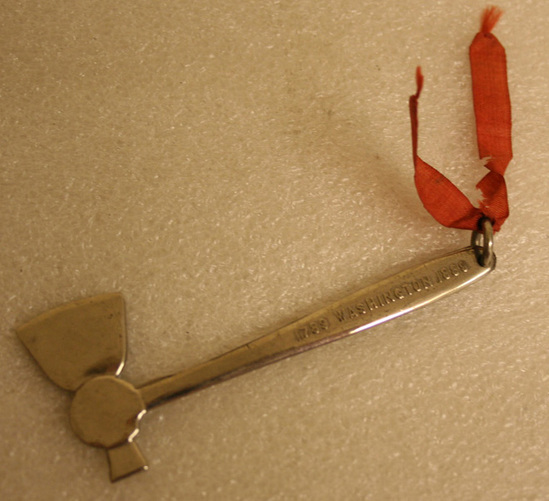 Small metal souvenir in shape of a hatchet or ax. Impressed into both sides of hatchet "1789 Washington 1889" Small ring attached ot end of hatchet with a piece of red ribbon extending from the ring. 1789 was the year that George Washington was inaugerated as the first President of the United States