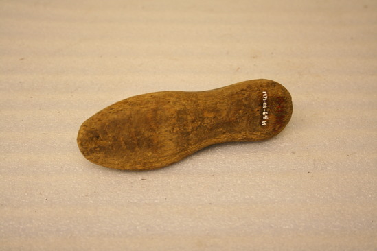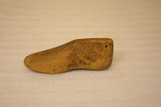 Child's size wooden shoe last. Hole drilled through back of heel. Rounded toe.