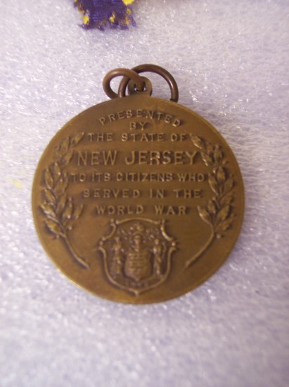 Pin bar - bronze, oblong shape with "NEW JERSEY" on front. Attached to bottom of pin bar is a blue and yellow ribbon. At bottom of ribbon is a round bronze medal with two links. Front side of medal has "VICTORY" at top with figure of victory and "WWI", period war vignette in background, lower legend "S. CHUDLEIGH HICKS/MAJOR INF. U.S.A./1917/-/1918" Back of medal has holly sprays on sides and NJ state shield below; inscrived "PRESENTED/BY/THE STATE OF/NEW JERSEY/TO ITS CITIZENS WHO/SERVED IN THE/WORLD WAR"