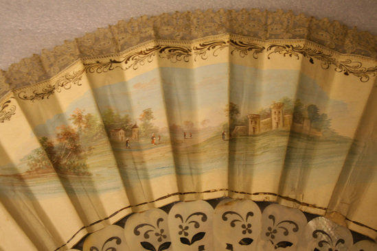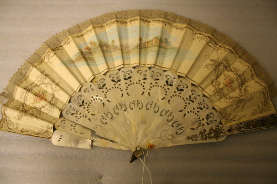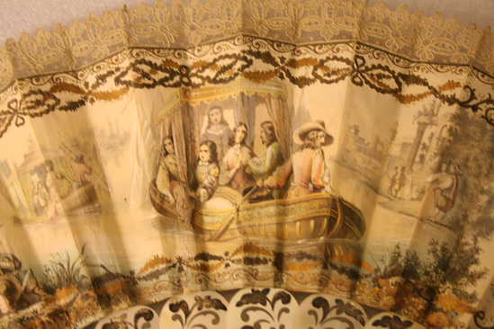 Paper fan of gilt printed paper with scenes of French men and women of 16th century in pleasure barges on one side and a landscape on the reverse side. Fringe of top of paper of white lace. Mother of pearl sticks pierced with gilt designs in rococo manner. Two opal stones at base pinning sticks together and brass handle.