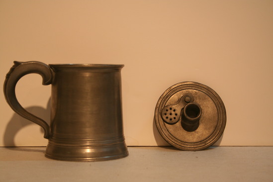 Pewter inhaler with maker's mark below rim. Ear shaped handle with three holes on top. One hold at bottom of handle on the interior of the tankard. Pewter lid with spout in center. Small cup with porous cover next to spout in lid.. Object was used for the inhalation of opium in the treatment of "catarrhous cough". Opium placed in the small cup in the lid would infuse into the heated water in the inhaler. Suction applied to the spout, via a flexible tube would draw air through holes in the hollow handle and through a single hole at its base which would buble in the infusion. Covering some or all of the holes in the handle would decrease the amount of air drawn through the infusion, and increase the more heavily laden opium vapors via the perfurated hole in the cup section.
