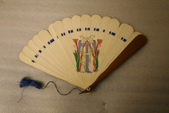 Fan of heavy cardboard with exterior ends of fan having wooden stretchers. Individual strips of cardboard rounded at top and strung together with blue silk ribbon. Mother of pearl button at base with silver metal handle. Painted in center of fan "F" "T" "W" in decorated overlapping letters.
