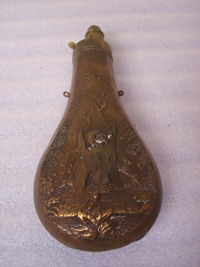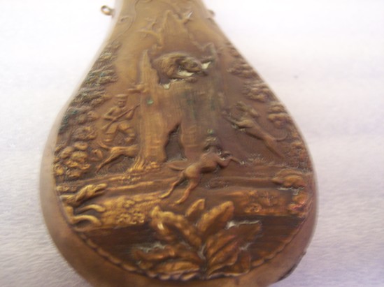 Pear shaped copper body with repousse hunting scene on one side of fox in stump with hounds and hunter in forest, brass collar, spout and thumb piece. Iron spring missing and 2 copper loops on neck with rings missing