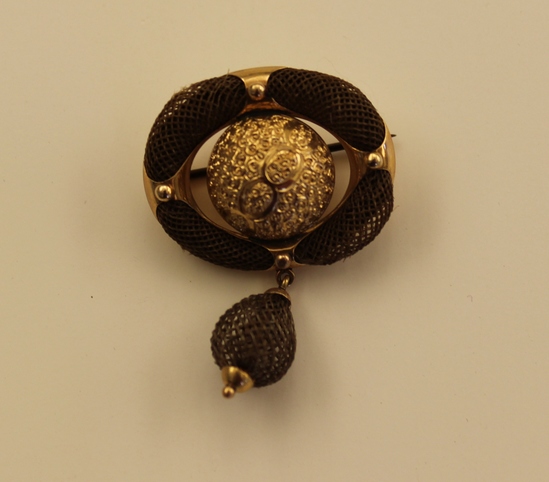 Three dimensional brown hair brooch set on gold backing; oval shaped with circular center of molded gold; pendant drop of hari with gold finial; straight pin with hook closure on back