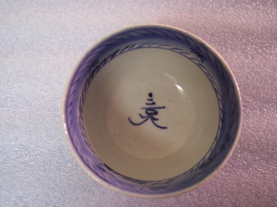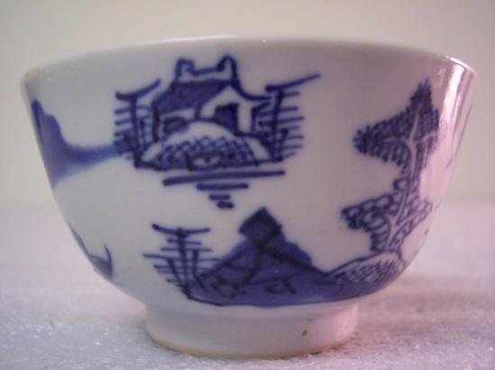 Tea bowl (i.e. handle-less teacup) on a round, footed base with blue-banded rim and an Asian scene of two houses, trees, and birds.