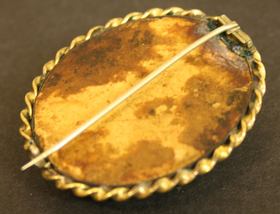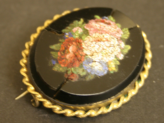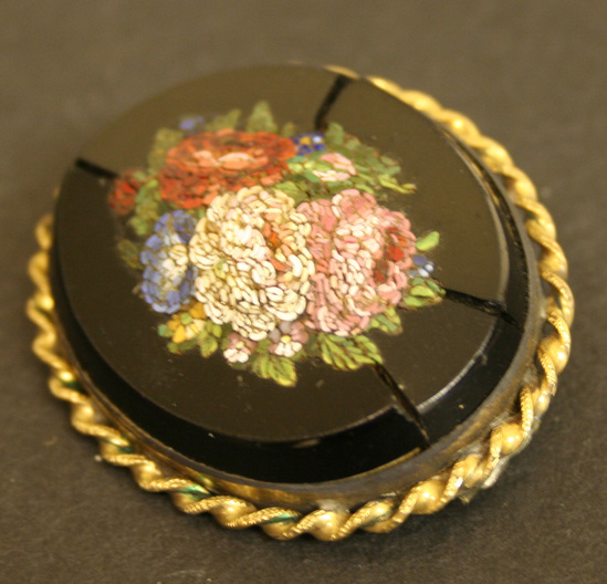 Oval shaped brooch. Gold setting with prominent rope twist border around outside edge. Raised black stone in center with mosaic design of a bouquet of flowers in center.