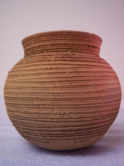 Small, Mexican pottery jar with incised line decoration wrapped horizontally around the pot. Round, squat body. Ceramic is red color and not glazed