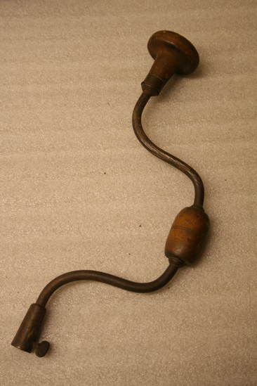 Iron and wood drill with C shaped elbow in middle. Iron body bent in a C shape. Round wooden handle at top. Oval shaped wooden pice in center of C shaped elbow. Iron bit at bottom where drill bit would be inserted. Bit missing
