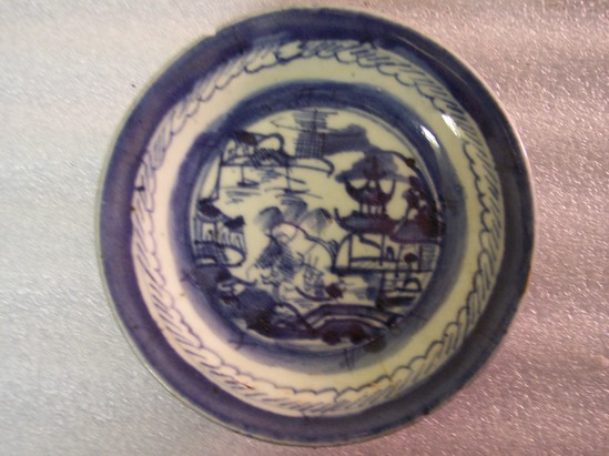 Round plate of a heavier and cruder construction than the saucers from this set. It is standard blue and white "Canton" river scene depiction. Wide blue band around the edge.
