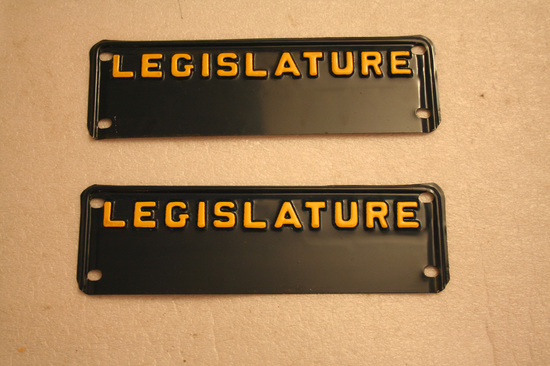 Aluminum license plates. Painted blue on front side. Hole in each corner. Across top in raised letters "LEGISLATURE" in yellow letters.