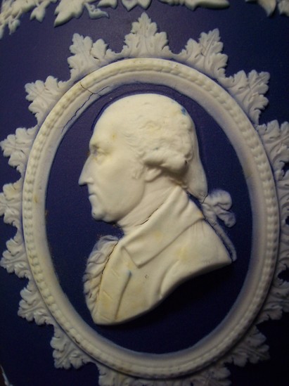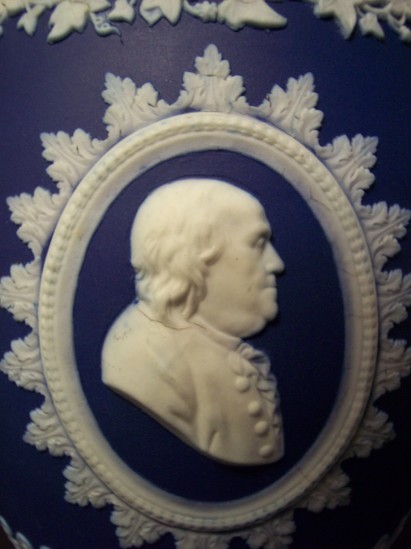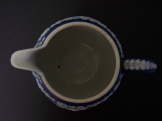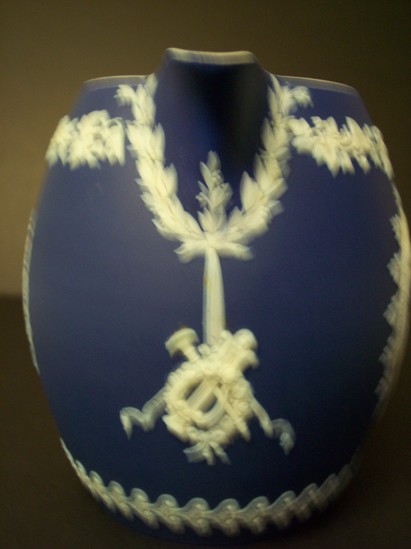 Blue jasper barrel-shaped pitcher with small spout and ear-shaped handle having white fern and leaf decoration applied down its back. White applied decoration on body, Greek spiral design on base, ivy chain around top, laurel around spout with classical trophy handing down by a ribbon. Bust of George Washington in frame on one side and one of Benjamin Franklin on the other side -- both done in profile. Stamped "Wedgwood. England. 24" and stamped with two symbols -- all on the bottom of the pitcher.