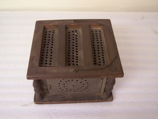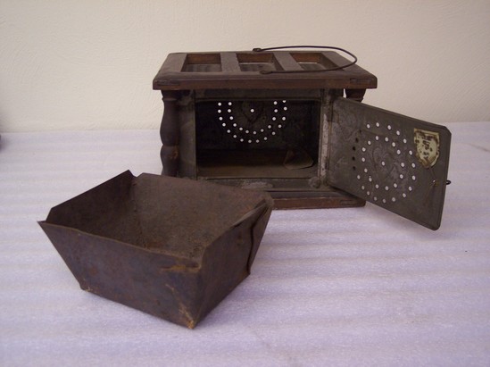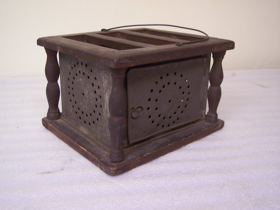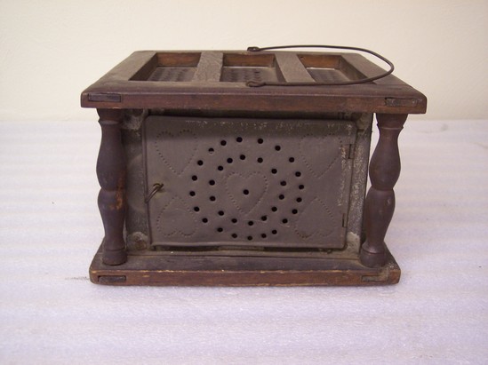 Rectangular wooden frame, with four turned corner posts, rectangular hetaer body of pierced tin decorated with hearts, hinged door on front of body opening to removeable heavy guage tin coal box. Footwarmer with bent wire carrying bail.