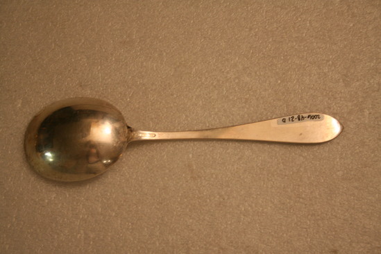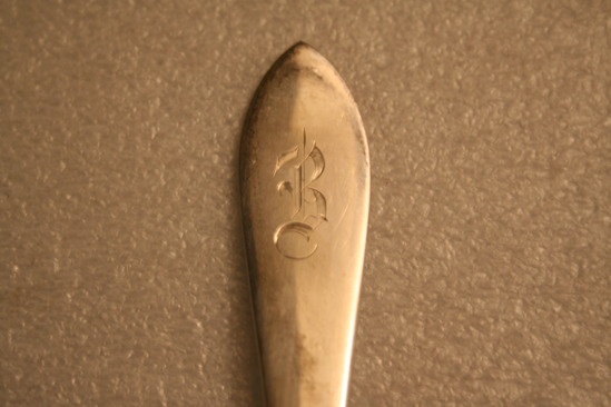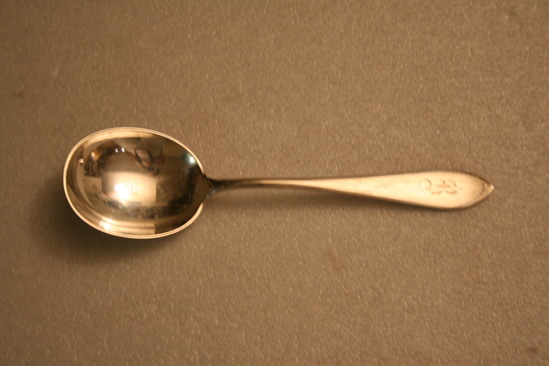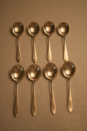 8 sterling silver soup spoons, Martha Washington pattern. Round, deep bowl. Handles comes to a soft point at end. "B" monogrammed at end of handle. Symbol on back of handle as maker's mark with word "STERLING"