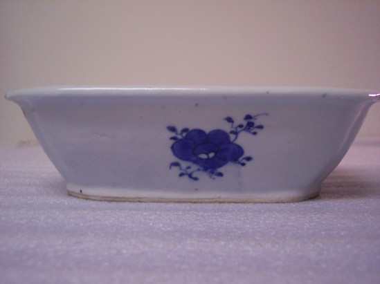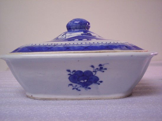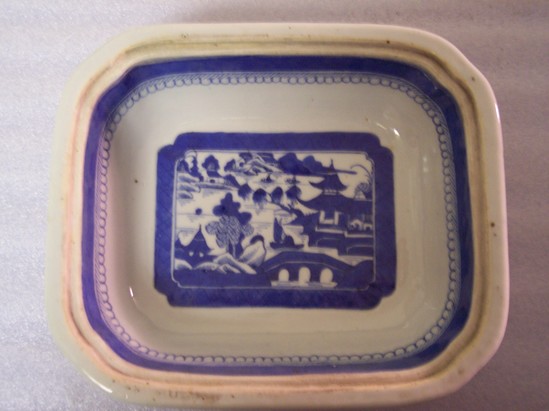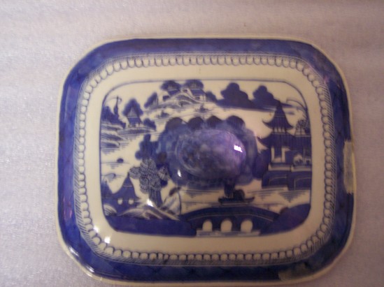 Base (A) has a solid rim foot. Oblong with indented corners. Interior river scene with decorative border, and on each exterior side is one large flower. Lid (B) is domed and oblong with a cabbage knop. River decoration on the outside. Dish was used by John Bissell and Catherine Marsh Bissell on East Street in Litchfield. Donor is great-great-granddaughter of John and Catherine Bissell.