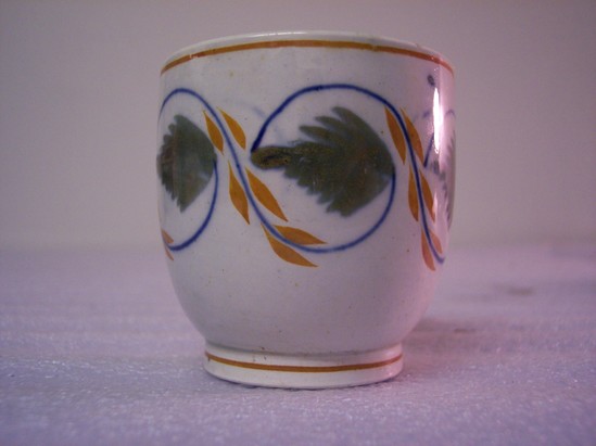 High, ring base with yellow glazed line. Egg-shaped body with yellow line just inside and outside rim. Blue line and yellow leaf spiral chain on body with green oak leaf connections. High, ear handle with brown YYY lines down outside. Blue "4" on base.