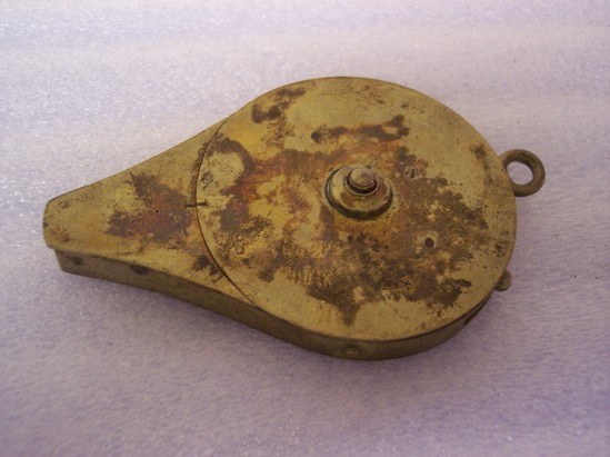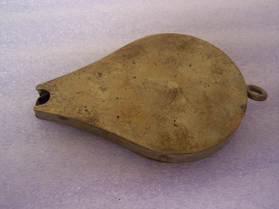 Brass, funnel shaped container with hole at smaller end and round ring at top of fatter end. Used for capping bullets during the Civil War