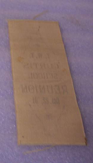 White silk ribbon with scrolled design at top and bottom. Printed in dark blue ink "T.W.T./Curtis/Schoo/Reunion/Oct. 22, '91"