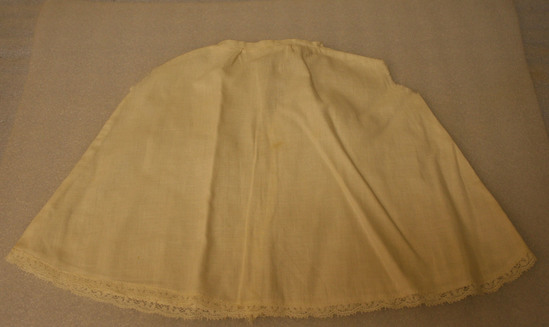 Machine sewn doll's petticoat. Waist band seamed in back from placket and on sides. Two arm holes have been cut at sides possibly with the idea of turning petticoat into a chemise.