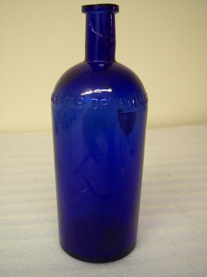 Large dark blue glass bottle. Impressed on side "Hall & Ruckel, New York/Wholesale Druggists"