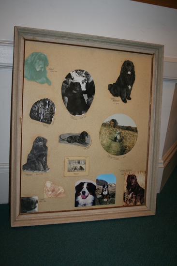 Large frame with glass. Underneath glass are various photos of dogs. Label underneath in black ink with name and either date of photo or dates when owned by Seherr-Thoss family. Several of the photos contain images of Sunny and/or Hans Seherr-Thoss with dogs. Two photos at bottom not labeled - photos are of Dasso, dog owned by Sunny Seherr-Thoss in 1980s/1990s