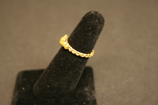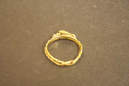 Lady's gold ring. Two gold bands next to each other of twisted robe design. Bands end at front in form of two clasped hands. Hands act as clasp for ring. By unclasping the hands, the ring opens.