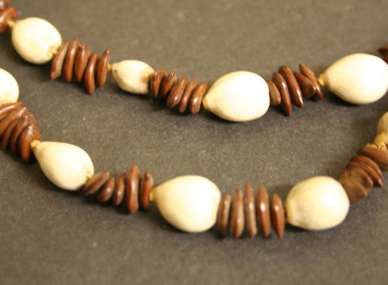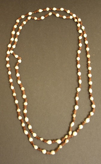 Strung beaded necklace made from natural seeds. Design created by alternating two different colored and shaped seeds. Oval shaped larger white ones interspersed with five small brown seeds. Creates one long strand of a necklace.