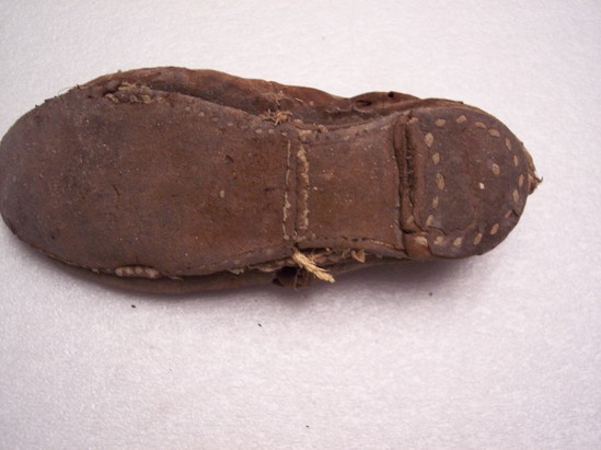 Shoe - leather on exterior and bottom of shoe. Seams sewn. Bottom of shoe partially sewn and partially tacked with iron tacks. 8 holes on top of shoe - 4 on each side. No lacing