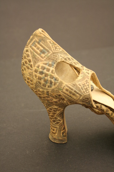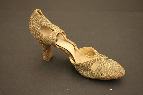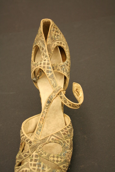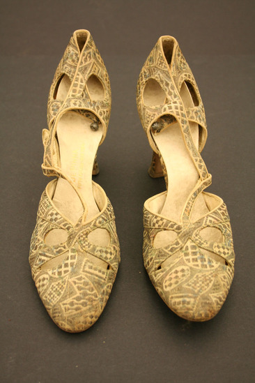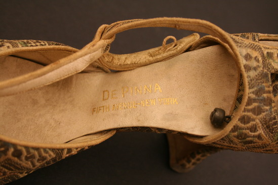 White cloth patterned evening shoes with open or pierced design and straps with metal ball fasteners; straps in T strap design; lined with leather; label on shoe "De Pinna/Fifth Avenue/New York" Four irregular shaped oval holes at toe of shoe; two irregular shaped oval holes on either side of heel; heel also covered with patterned fabric; metallic thread creates geometric shapes with various checkered patterns inside