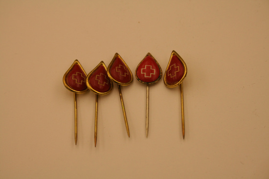 5 individual American Red Cross pins; body of pin in shape of a droplet - red plastic with outline of cross in center. Plastic droplet recessed in gold metal frame - also in shape of a droplet. Long stick pin extends below pin.