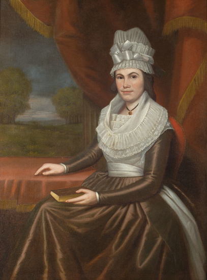 Oil on canvas portrait of Mrs. Nicholas Shelton Masters, (1759-1842), 3/4 length image of a woman seated, facing left, in a red upholstered side chair, her right arm resting on a table covered with a red cloth, her left hand in lap holding a book. Long straight brown hair and brown eyes, Wearing a lace mop cap, a burgundy silk dress with a lace overbodice, double lace collar, a gold locket hangs around her neck. Red drapery to the right, an open landscape to the left