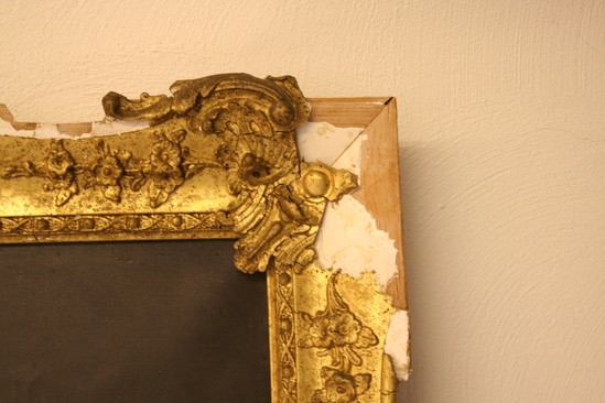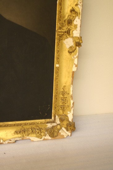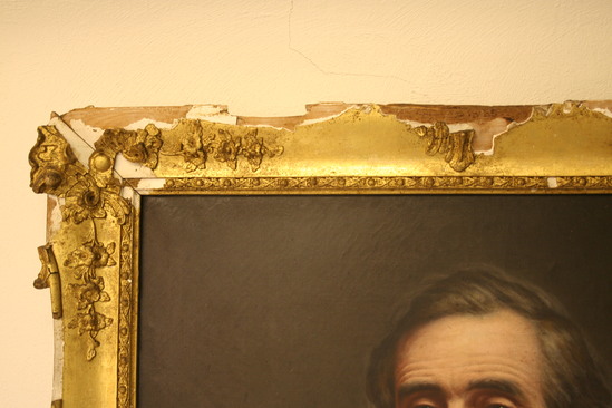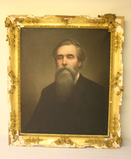 Oil painting of Gideon Hollister. Head and upper torso. He faces slightly left. Wearing a dark suit. Full grey beard which extends to top of chest. Longer grey hair parted on right. Blue eyes. Dark background. Wooden frame with elaborate plaster decoration, gilded.