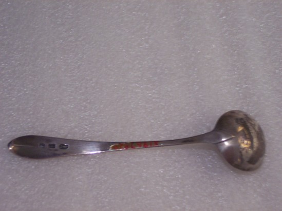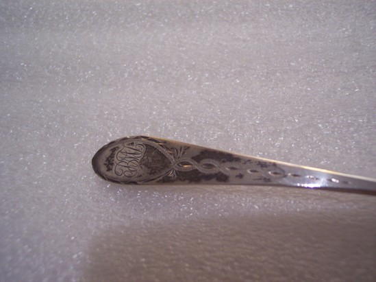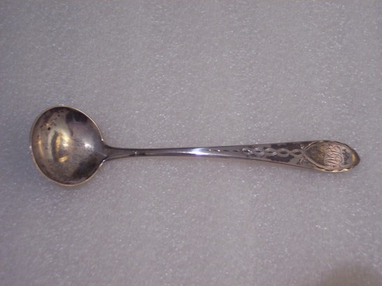 Small silver spoon with round bowl, handle Kovel 1790 shape. Engraved initials "BMT" on handle with circle and pendant husk decoration. Initials stand for Benjamin and Mary Tallmadge.