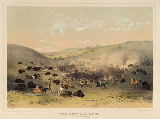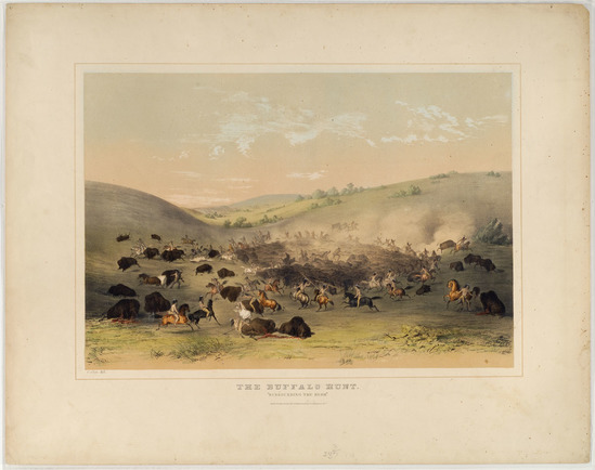 Lithograph printed by Currier & Ives, 152 Nassau St., New York City, NY after the original painting by George Catlin. Picture shows buffalo herd surrounded by Native Americans on foot and horseback. The air is filled with dust from the running buffalo. There are animals laying on the ground, wounded or dead from arrows.