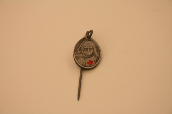 Stick pin, bent 90 degrees at top with ring at end, oval charm hangs from end, raised image of woman's head and shoulders in Red Cross uniform, red cross on her chest